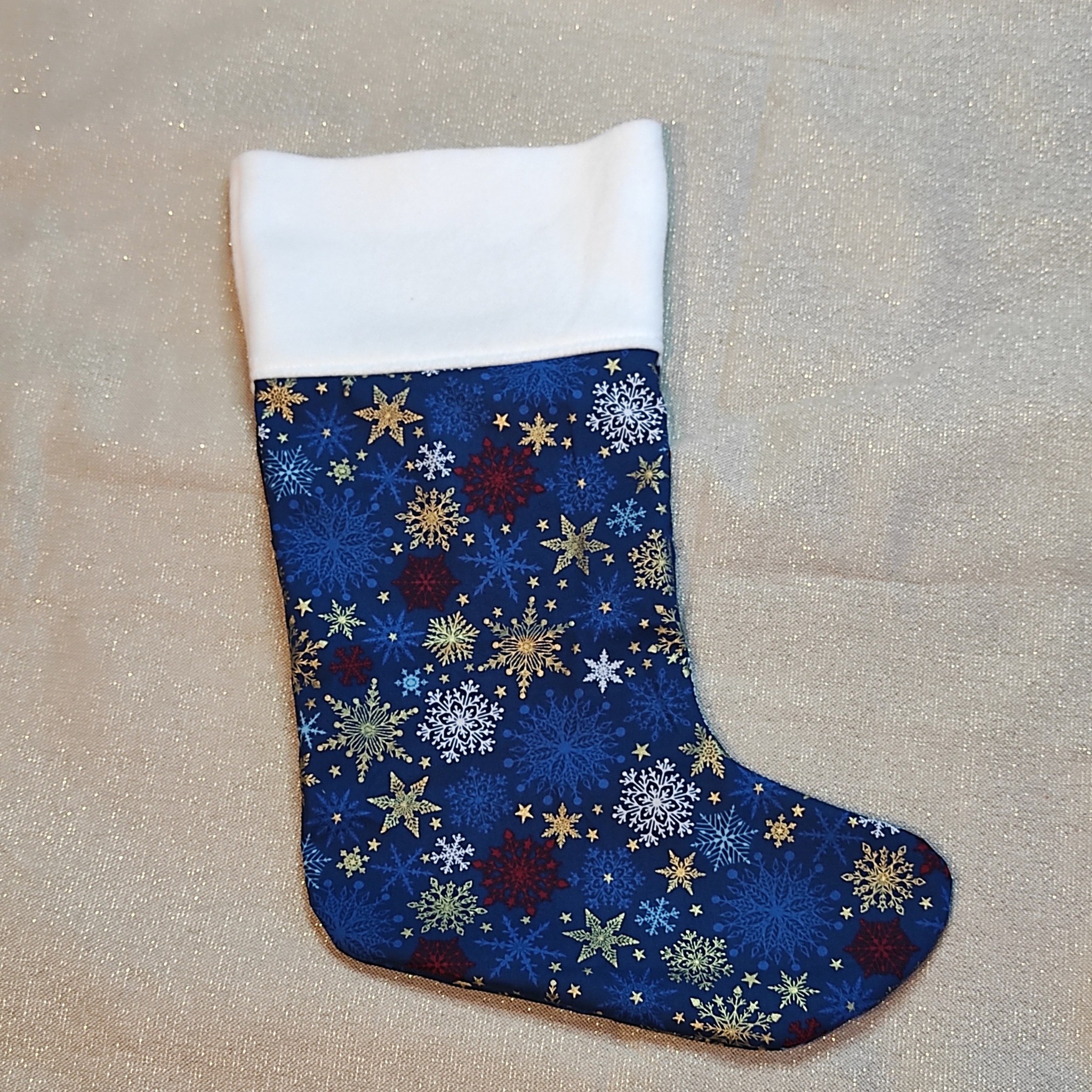 Pour un Noël unique, je vous propose cette jolie chaussette de Noël bleue avec de magnifiques flocons dorés, rouges et argentés.