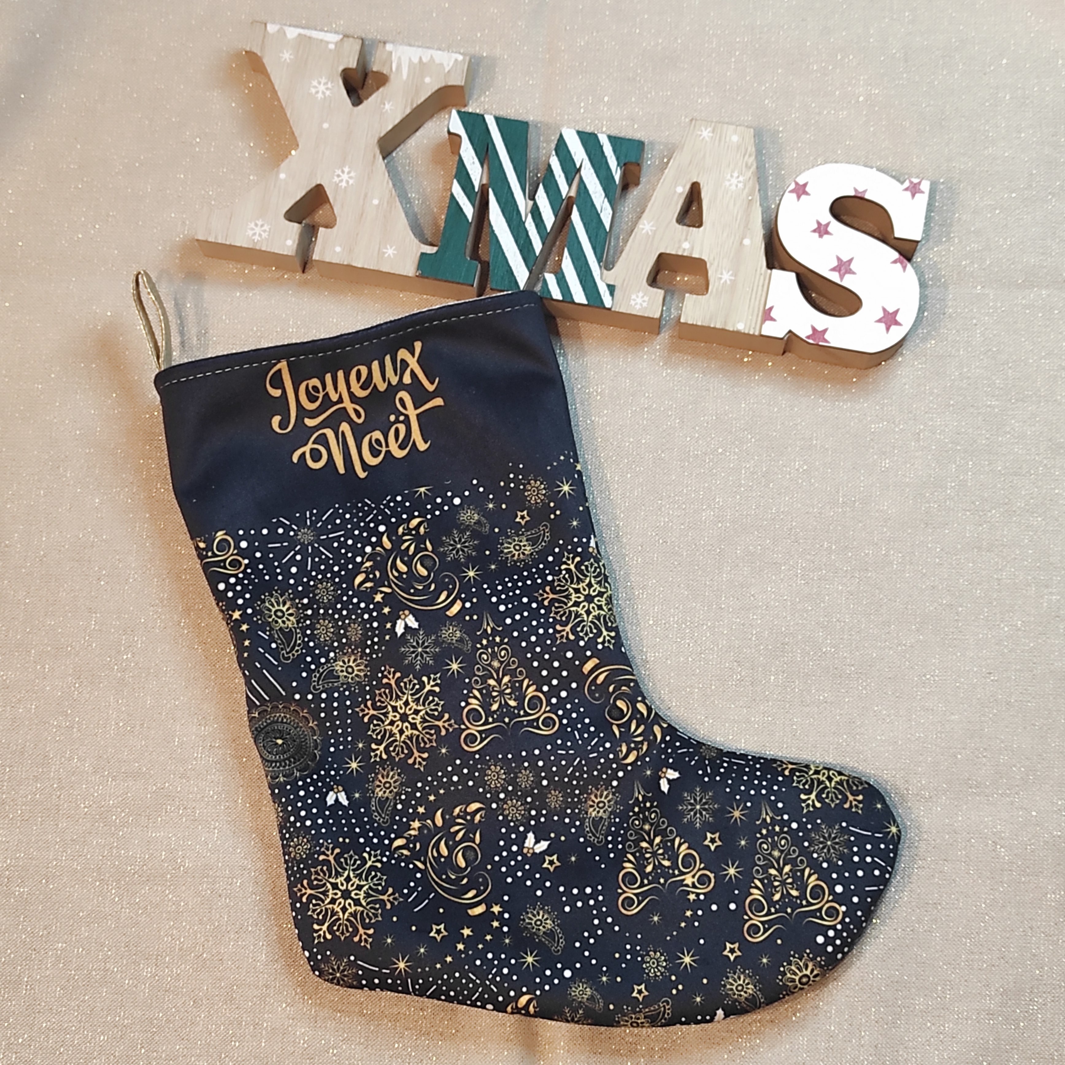 Pour un Noël unique, je vous propose cette jolie chaussette de Noël en velours noire et dorée.