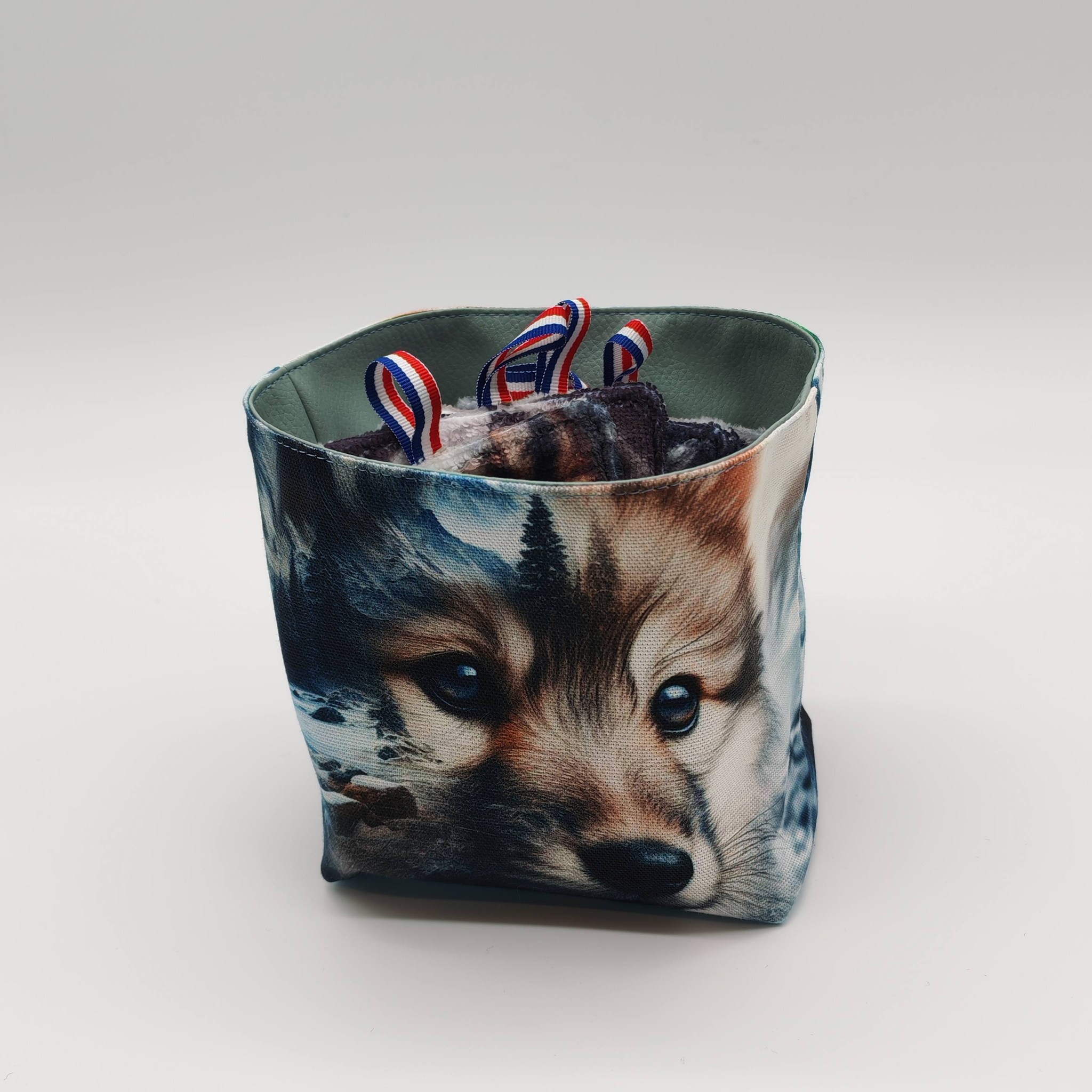 💄 Panière lingettes lavables loup – coton imprimé & simili – fait main