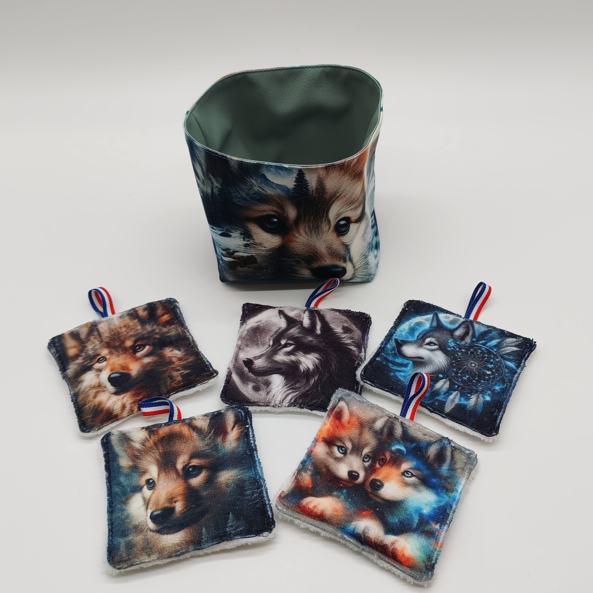 ✨ Apportez une touche de nature et de caractère à votre routine beauté avec cette panière en coton imprimé loup accompagnée de ses lingettes lavables assorties 🐺