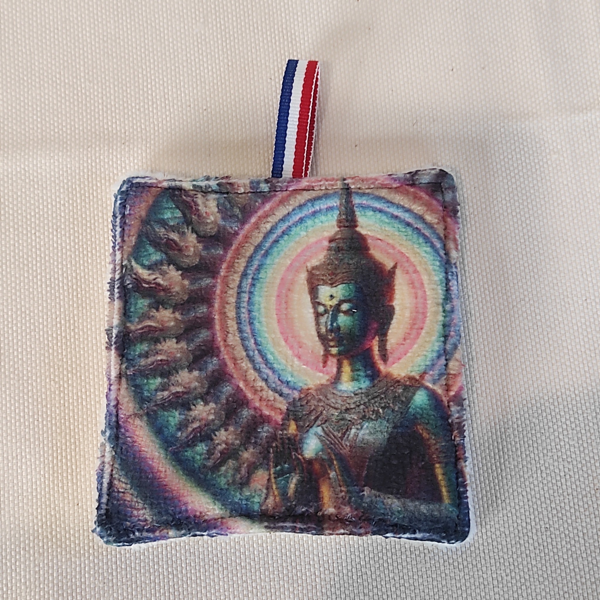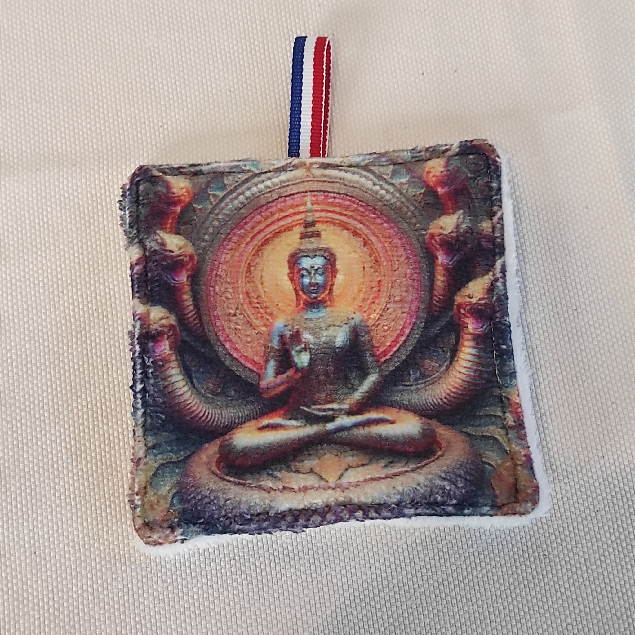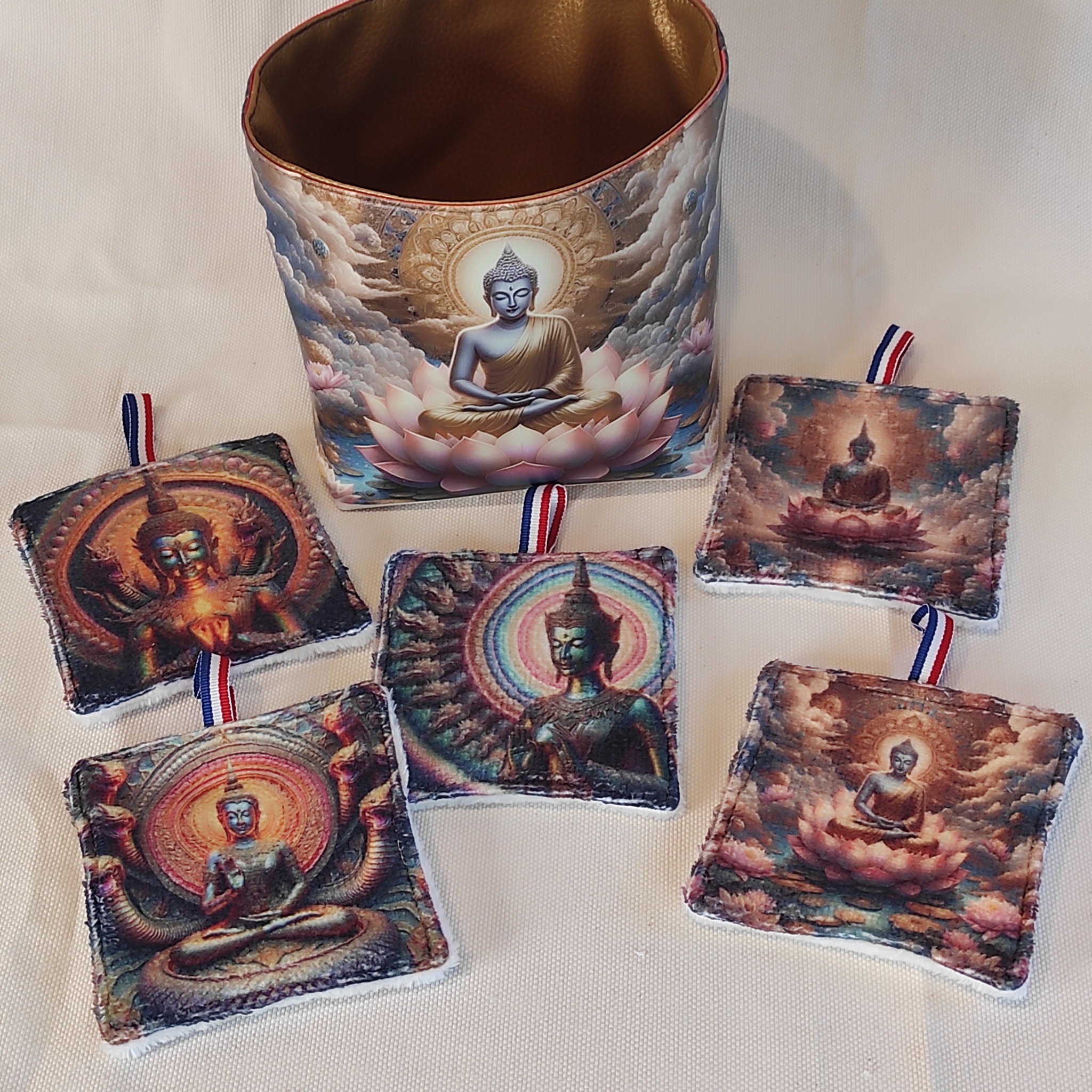 Imaginez un écrin de beauté, une panière en simili ornée d'un majestueux Bouddha.