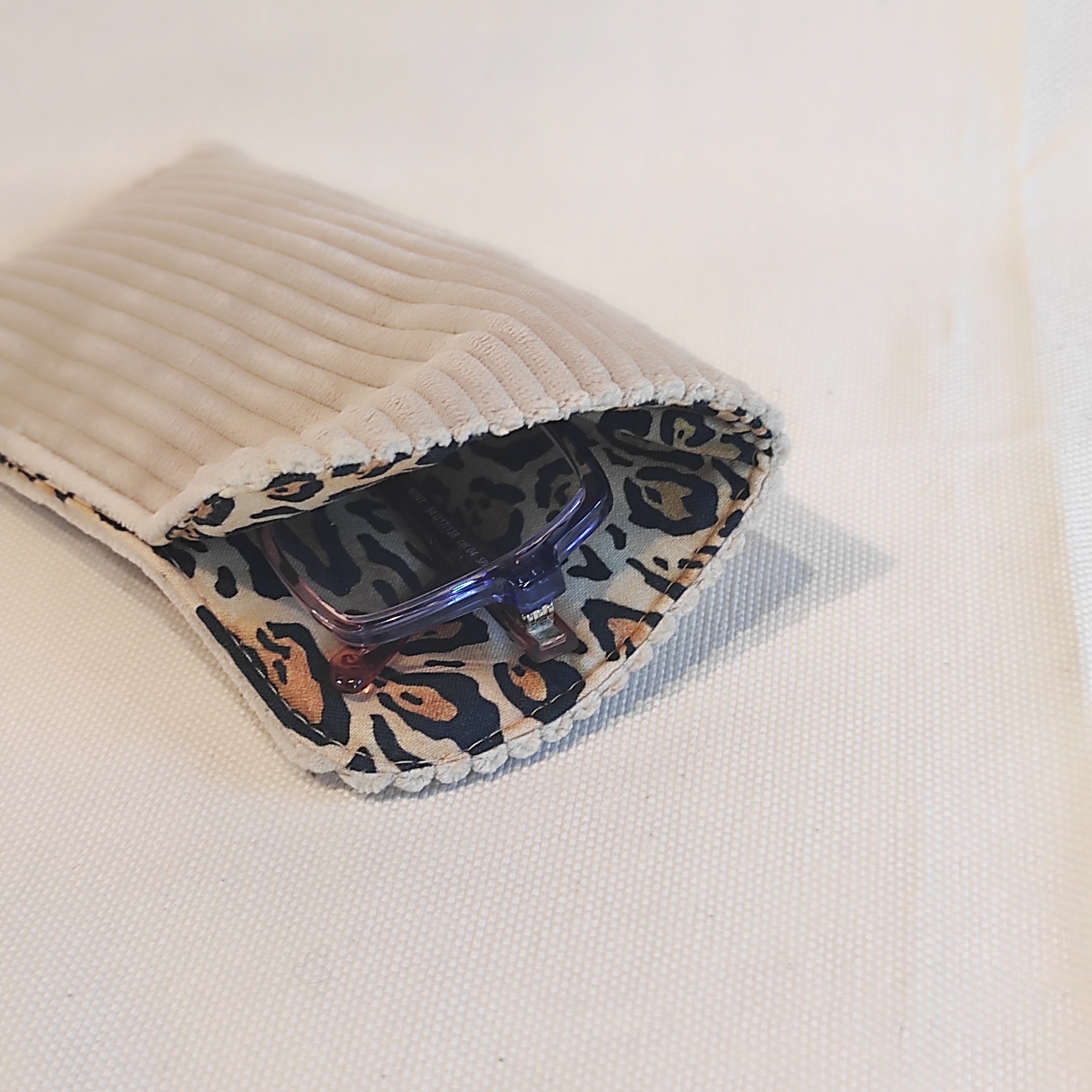 À l'intérieur, vos lunettes seront choyées et en sécurité. La doublure est composée de ouatine, spécialement choisie pour amortir les chocs et prévenir les rayures. Cette couche est recouverte d'un coton léopard, ajoutant une touche chic à chaque fois que vous y glissez vos lunettes.