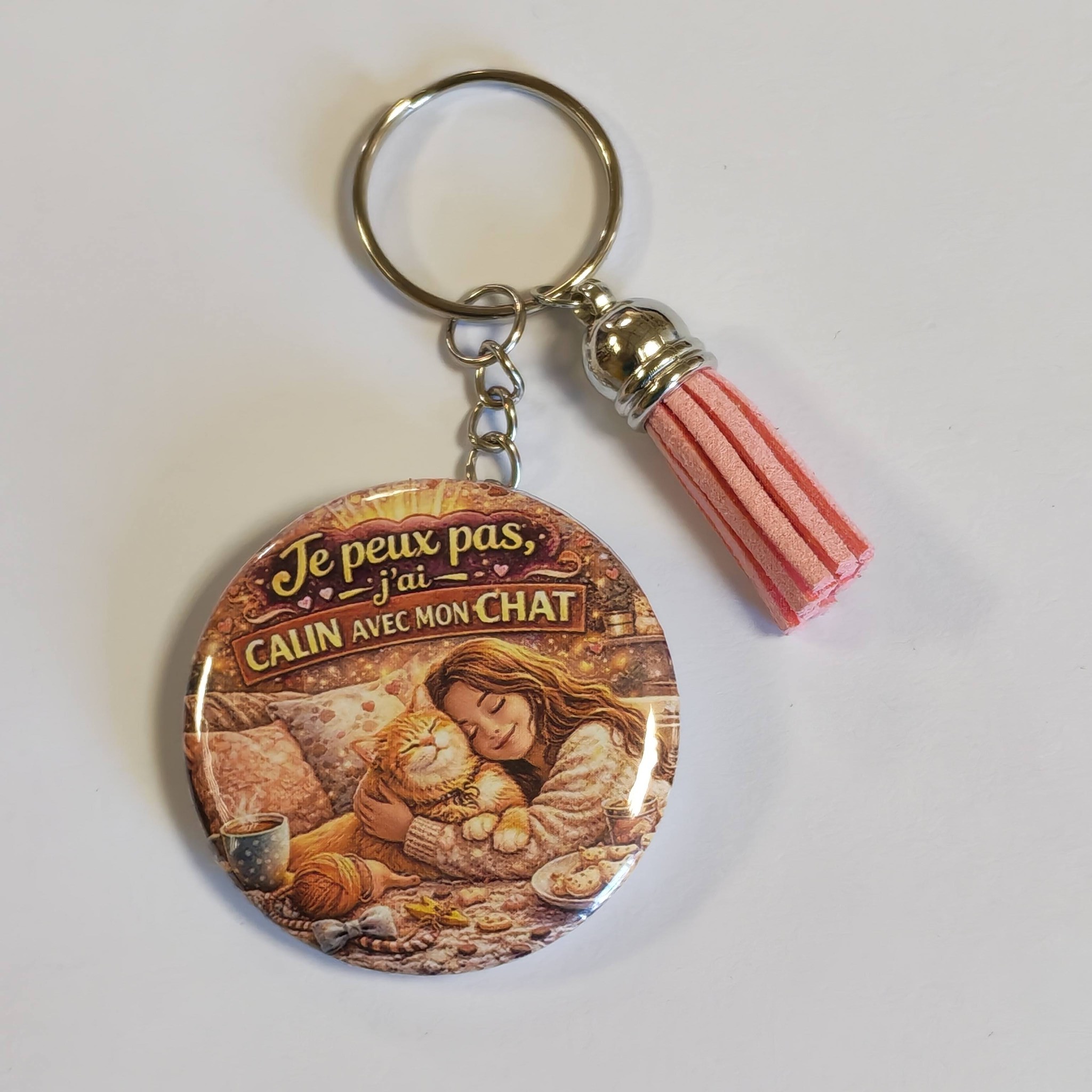 Porte-clés badge humour chat avec pompon – “Je peux pas j’ai câlin avec mon chat”
