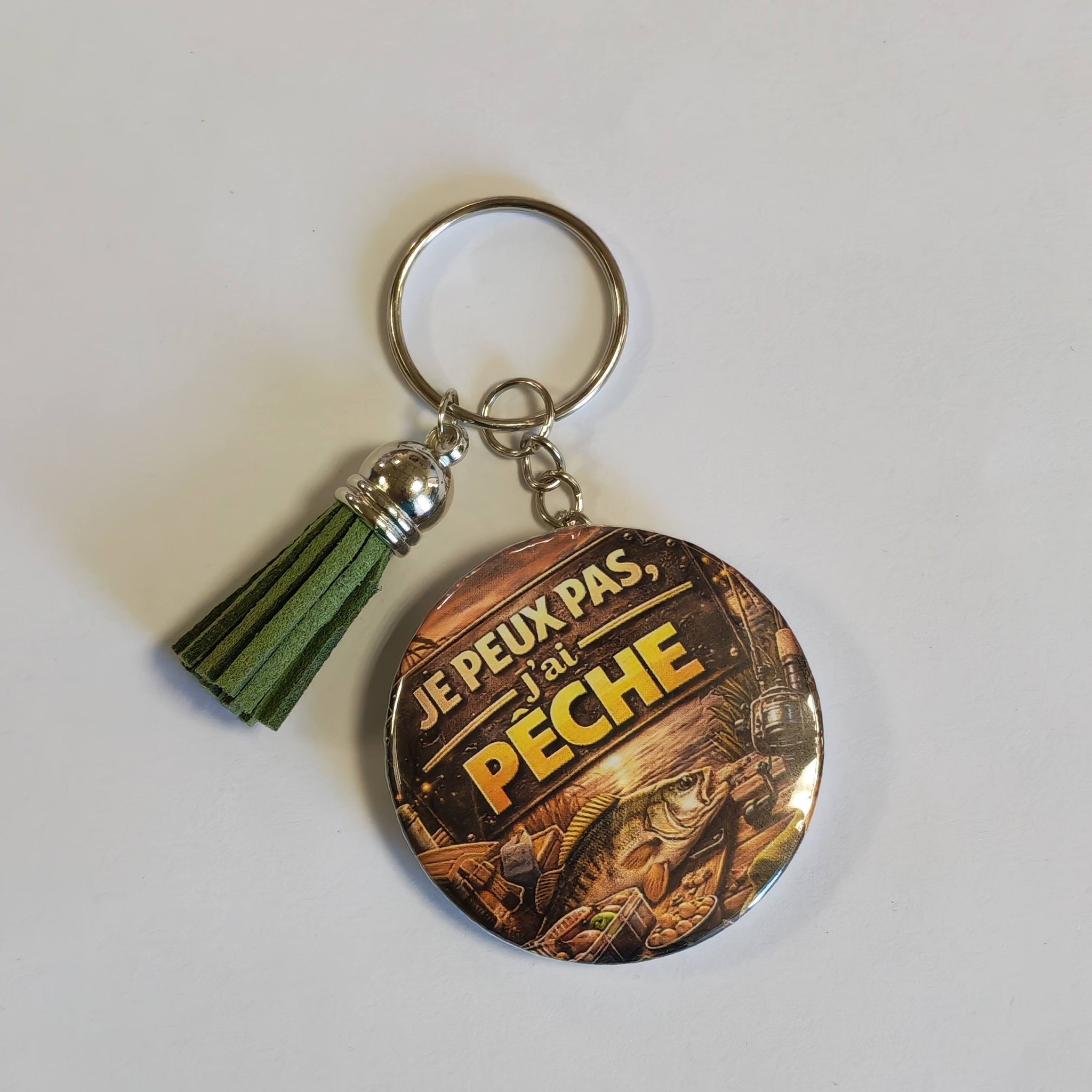 Porte-clé badge décapsuleur pêche – cadeau fête des pères original “Je peux pas j’ai pêche” avec pompon vert