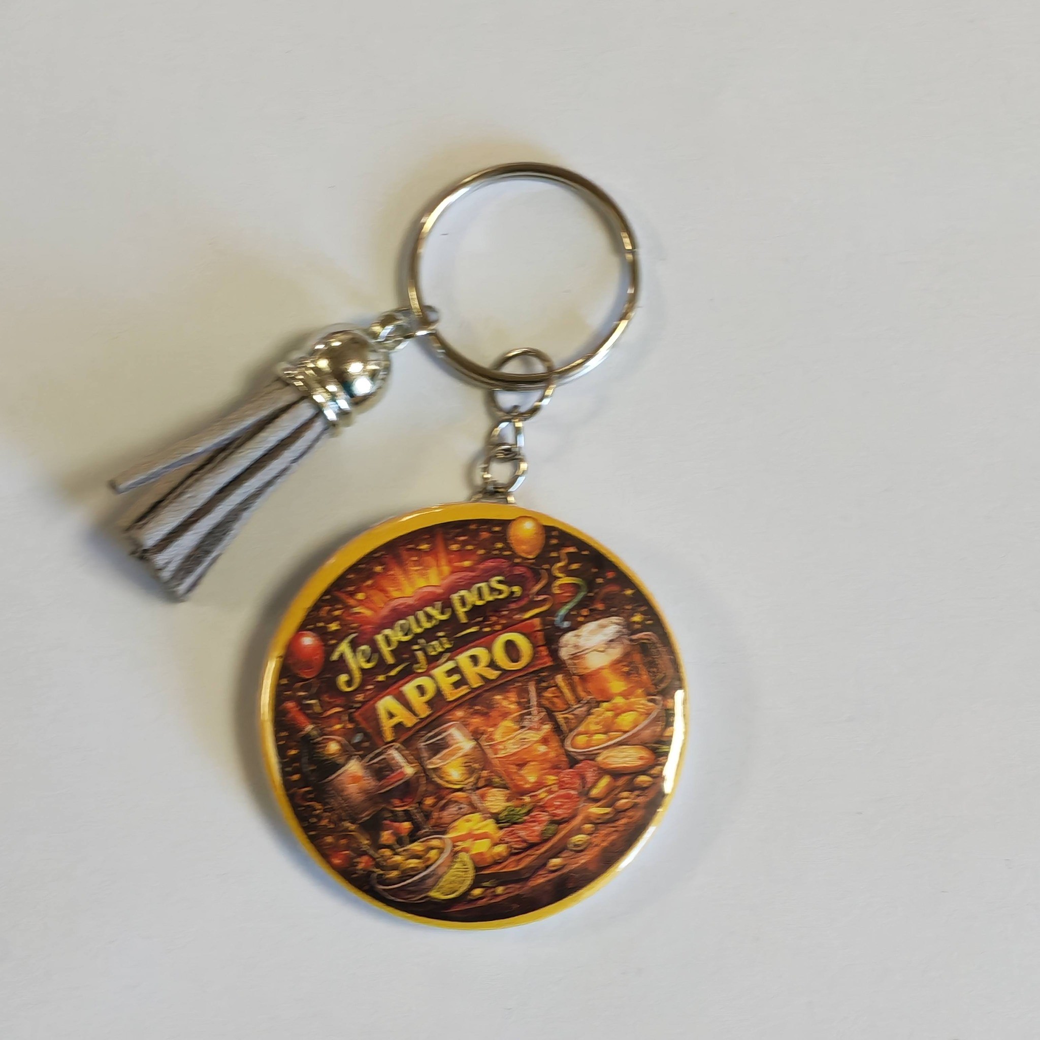 Porte-clé badge décapsuleur apéro – “Je peux pas j’ai apéro” idée cadeau humour avec pompon gris