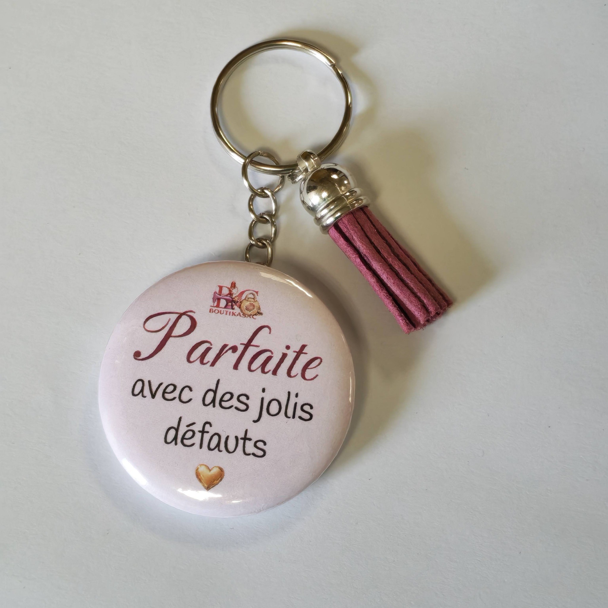 Craquez pour ce porte-clé badge classique “Parfaite avec de jolis défauts”, un message doux et inspirant à emporter partout avec vous.