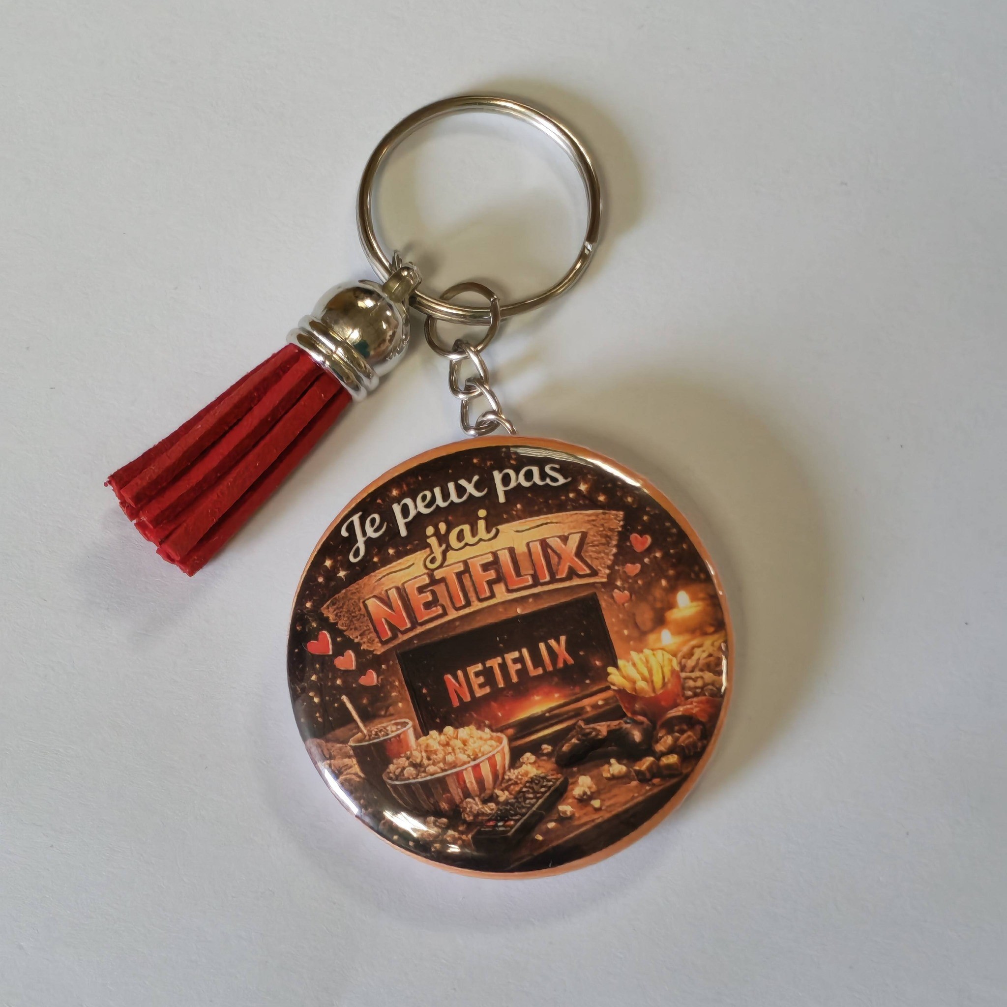 Porte-clé humour Netflix – “Je peux pas j’ai Netflix” porte-clé badge rouge idée cadeau fun cinéma série