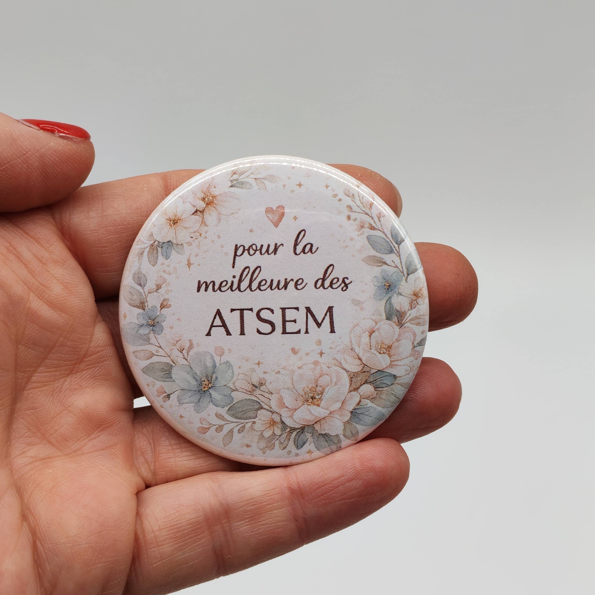 Badge miroir 58 mm – Maîtresse et ATSEM – Cadeau fin d’année scolaire
