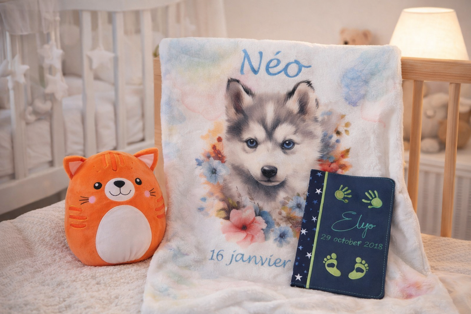 Couvertures, carnets de santé brodés et peluches soigneusement sélectionnées et brodées font de chaque piÚce un souvenir précieux à offrir ou à conserver.